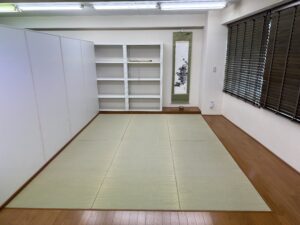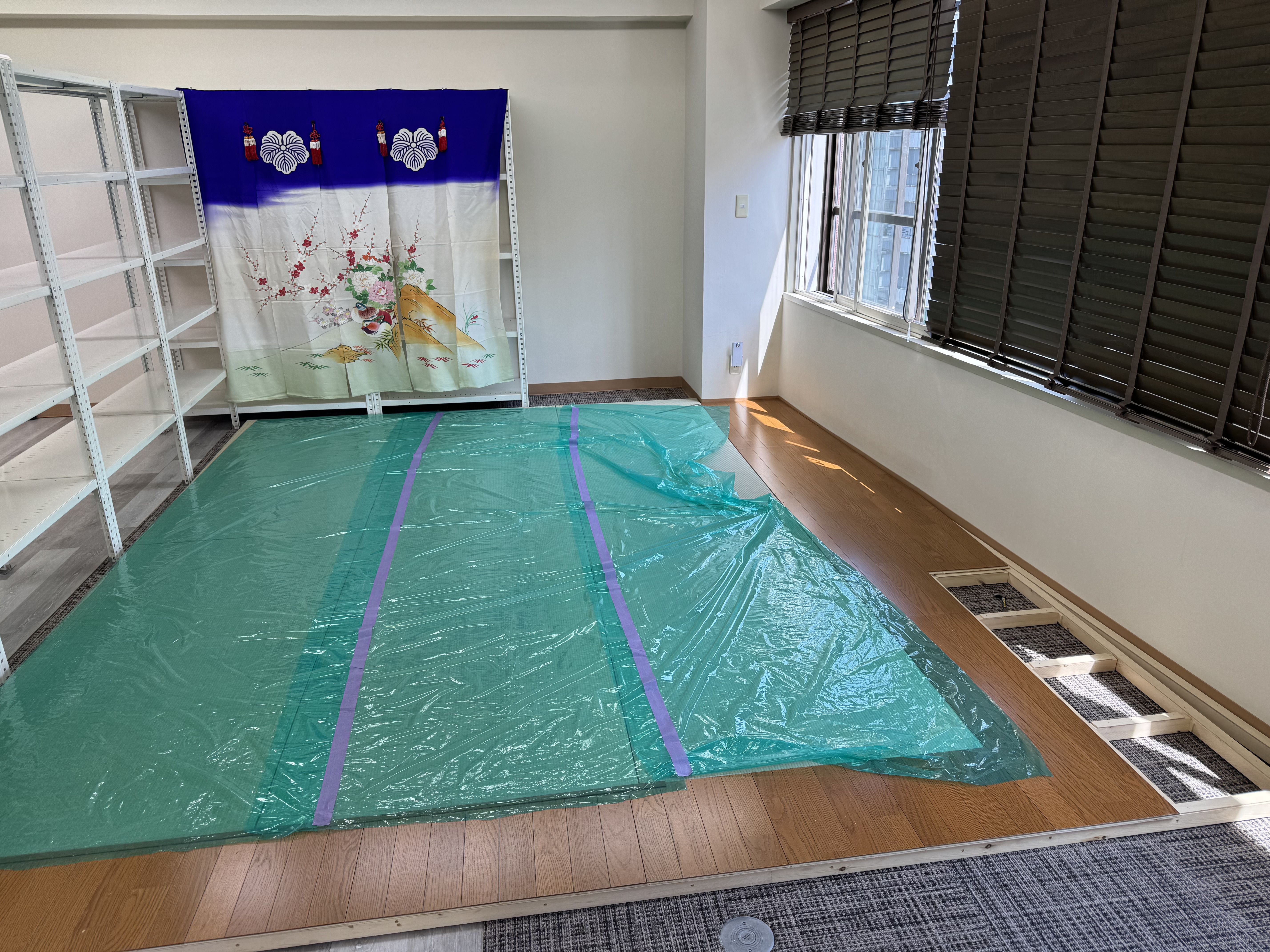 次に右の絨毯の上にたたみを敷くわけですが、上野の畳屋さんクマイ商店さんに縁なしの本畳を注文、これも縁有りの建材を挟んだ畳を進められましたが、いや断固として縁なしの目積本畳が良いと無理を通しました。今、藁が集まらないらしく、本畳が間に合うのか、これも時間との戦いでした。