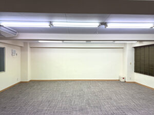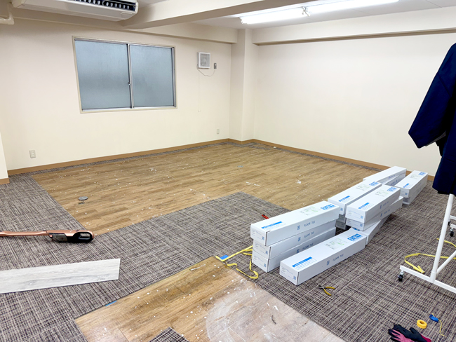 これが、最初の部屋の様子です。僕は、絨毯は将来的に汚れると掃除ができないと思い、フローリングにしたいと思いました。そして、畳も入れたいと考えました。当然、全員に反対されました。無理だというご意見と、間に合わないのと金銭面できつくなるというごもっともなんです。とりあえず、このまま始めればと言われましたが、営業はじめたら、それこそ、床を変えるのは無理だろうと僕は思いました。最初にやるしかないと。そして、ほんとギリギリのタイミングでフローリングを購入、プロに施工を頼むと高いので、僕と先輩俳優であります薗田さんと友達の村越さんに手伝ってもらって床を引き剥がす、したはフローリングだったのですが、ペンキで使い物にならないので、その上にタイルをはっていきます。